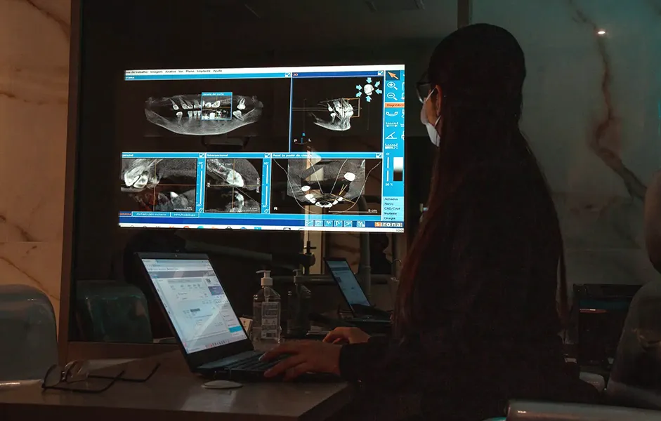 Em sua primeira visita, realizamos uma avaliação detalhada com exames de imagem e scanners intraorais para diagnosticar suas necessidades reais. Nossa equipe de mais de 40 mestres e especialistas explicará cada etapa do tratamento, garantindo que você tenha clareza total sobre o investimento na sua autoestima.